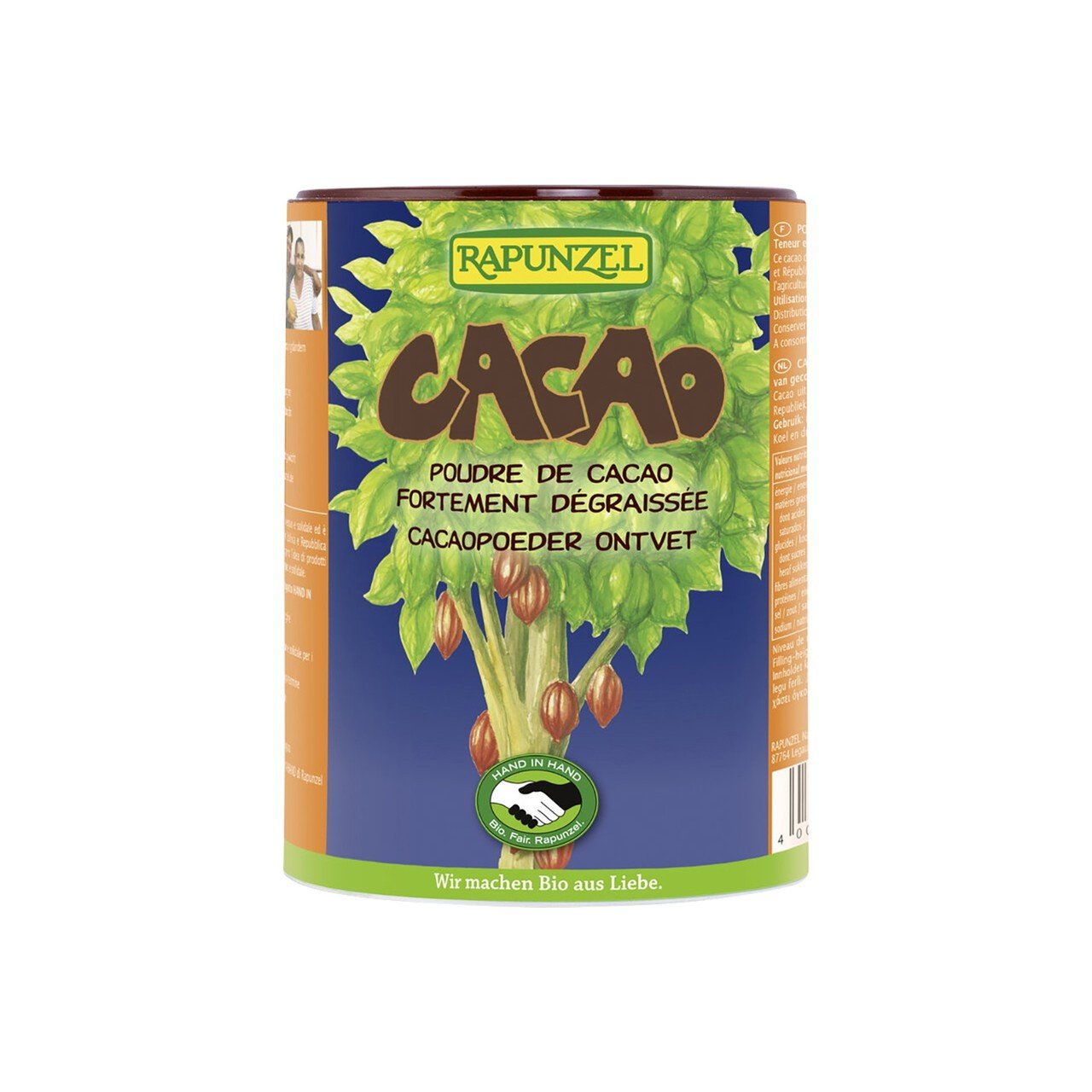 Le cacao provient de nos partenaires HAND IN HAND en Amérique latine. HAND IN HAND signifie un soutien direct aux paysans par le biais d’un commerce équitable de matières premières bio de haute qualité. Pour la pâtisserie, les desserts et comme chocolat chaud, un délice.