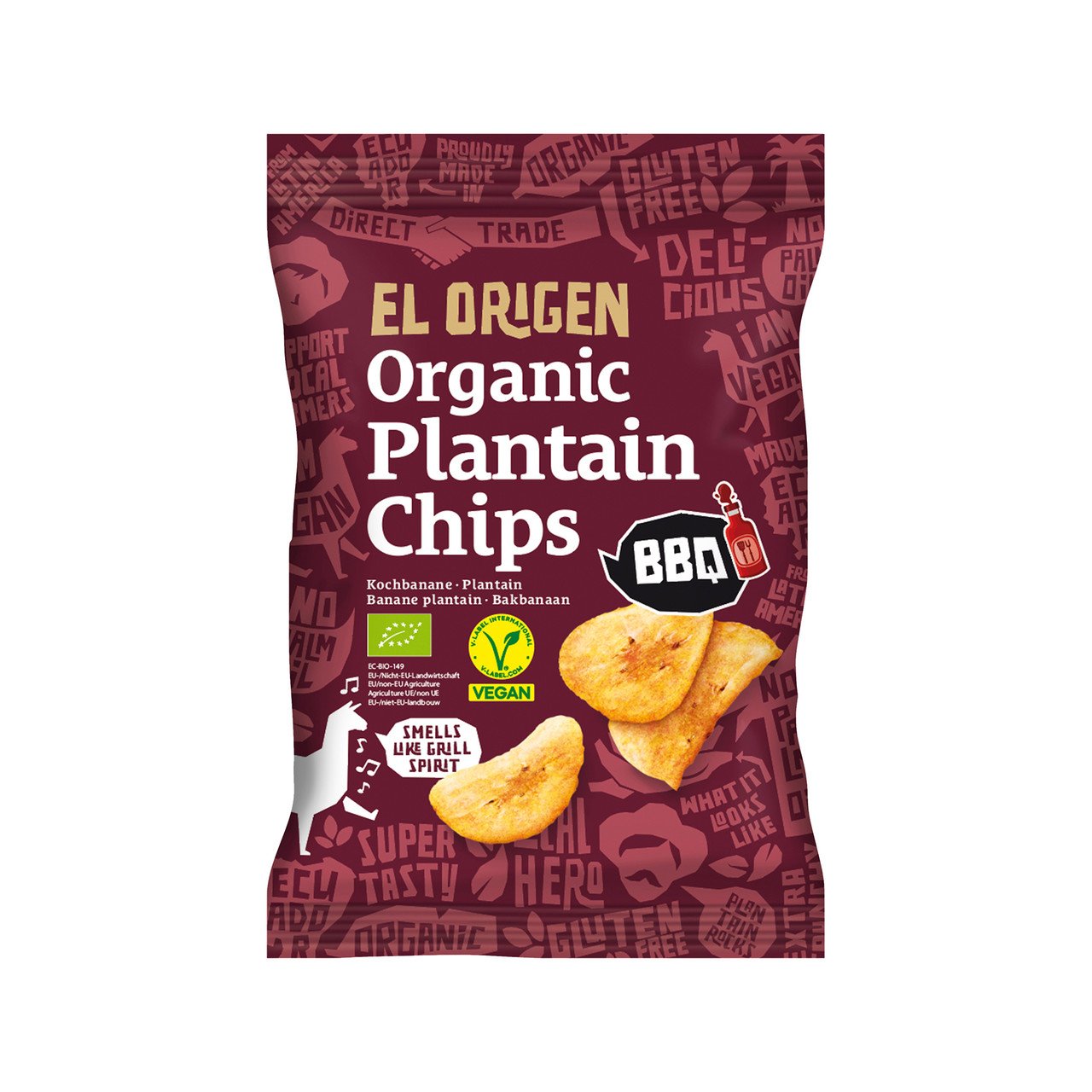 Banane plantain* (64 %), huile de tournesol*, mélange d’épices (dextrose*, tomate*, paprika*, sel, ail*, oignon*, arômes naturels issus d’extraits végétaux et acidifiant : acide citrique*), sel marin