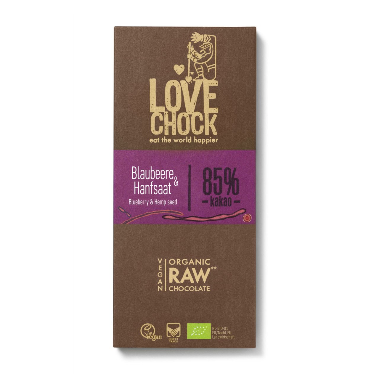 Chocolat cru aux myrtilles & graines de chanvre84%, UE Bio