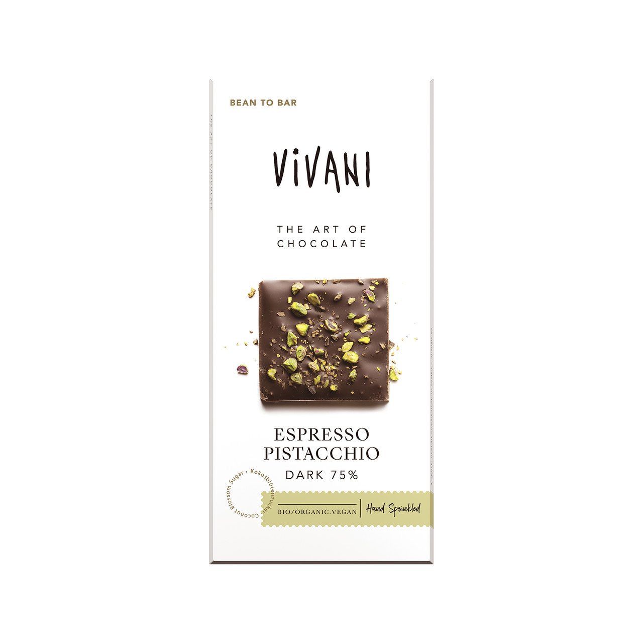 Chocolat noir fin avec 75% de cacao et sucre de fleur de coco sucré, saupoudré à la main de morceaux de pistaches salées et de poudre d’espresso.
