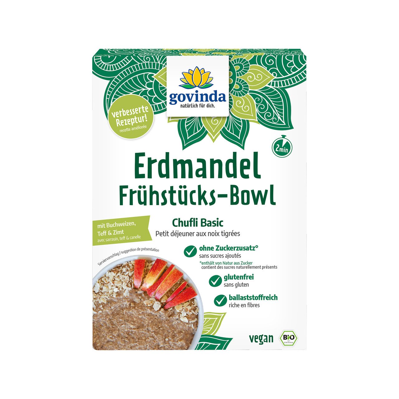Souchet moulu* 18%, souchet concassé* 15%, cubes de figues* (figues*, farine de riz*), flocons de sarrasin* 8.6%, flocons de teff* 8.6%, graines de tournesol*, cubes d’abricots* (abricots*, farine de riz*), graines de chanvre*, son de quinoa*, morceaux de pommes séchées*, cannelle* 0.7%. Légende: * Biologique, ** Bourgeon, *** Demeter