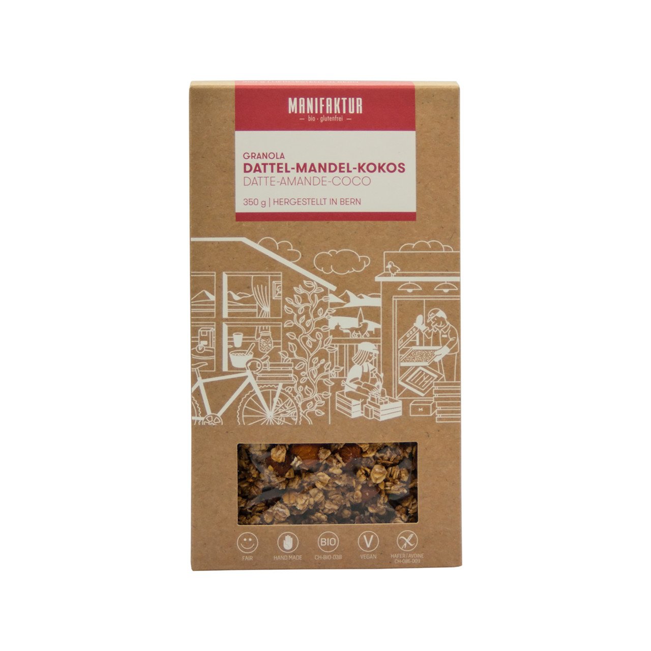 Flocons d’avoine complets sans gluten* (<20ppm), pâte de dattes* 24%, AMANDES grillées* 10%, noix de coco râpée* 8%, raisins de Smyrne*, graines de courge*, cannelle*, cardamome*. Légende: * Biologique, ** Bourgeon, *** Demeter