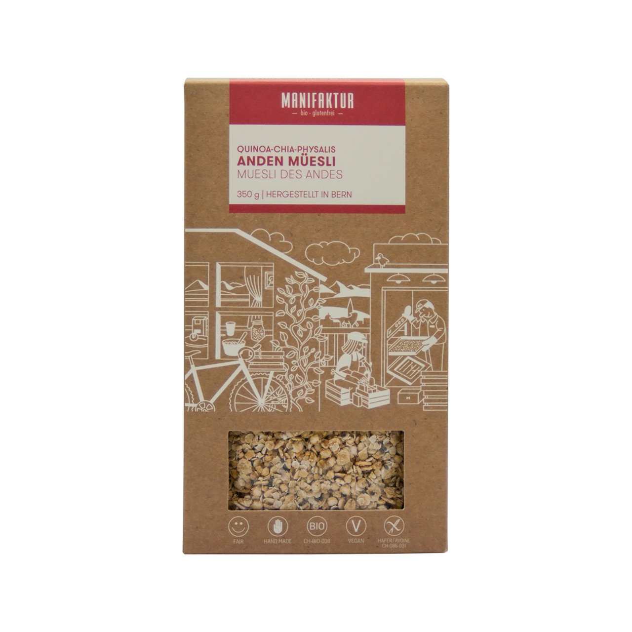 Commencer la journée avec puissance! Le Muesli des Andes se compose de quinoa, d’avoine, de chia et de physalis – les baies des Andes, celles-ci arrondissent l’expérience gustative. Le muesli est sucré de façon naturelle, artisanal et a été rôti délicatemen.