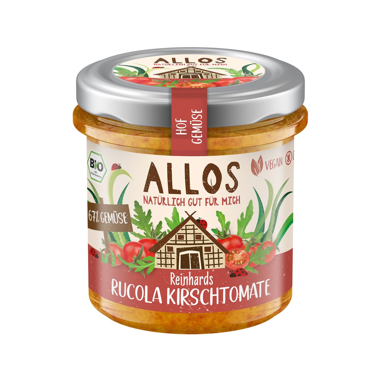 Tomates* 37%, graines de tournesol*, carottes* 10%, huile de tournesol*, roquette* 9%, tomates cerises* 7%, fécule de pomme de terre*, sirop d’agave*, concentré de tomates* 2%, jus de betterave rouge à base de concentré de jus de betterave rouge* 2%, concentré de jus de citron*, sel de mer, oignon en poudre*, épaississant: farine de graines de caroube*, piment en poudre*. Légende: * Biologique, ** Bourgeon, *** Demeter