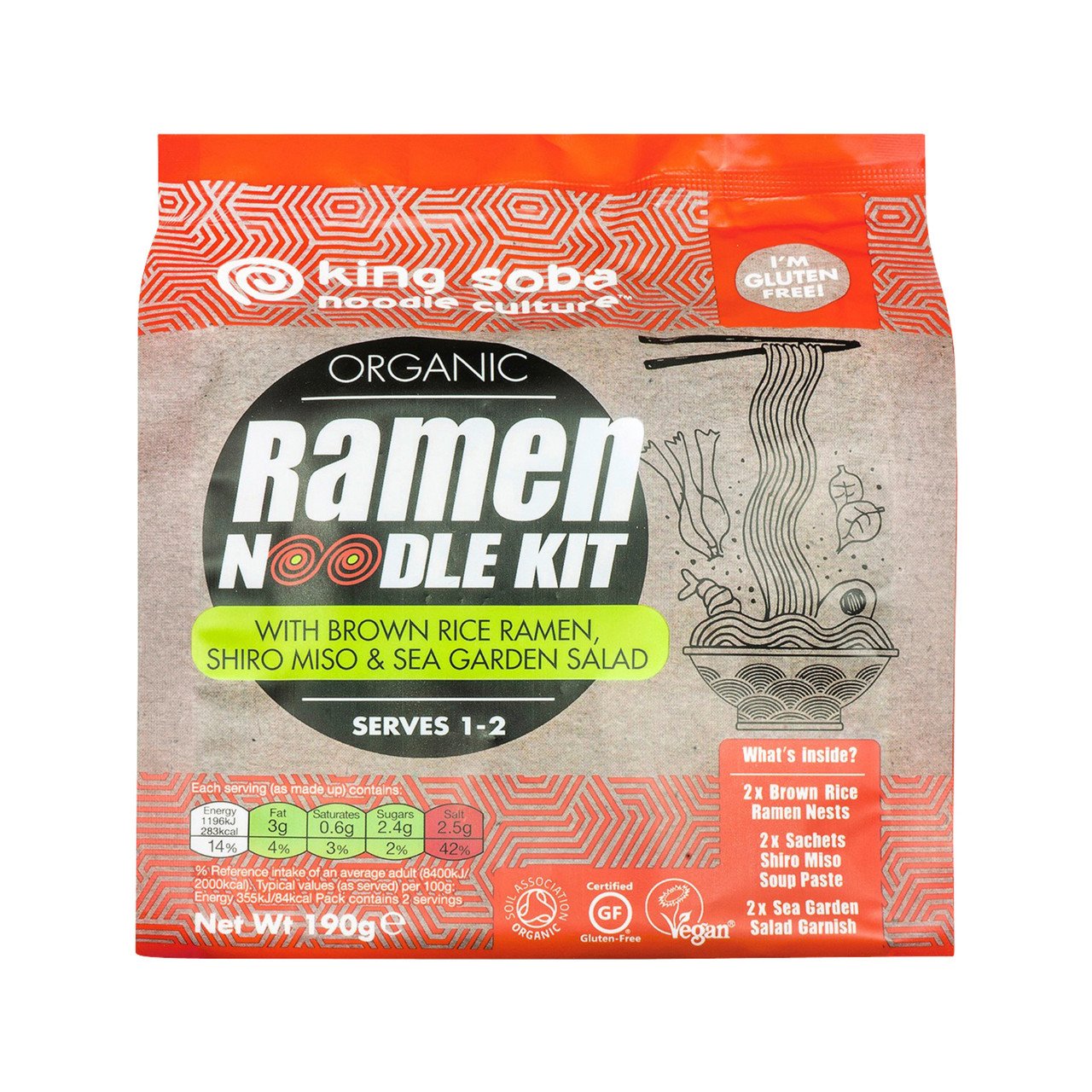 Nouilles ramen de riz brun 73% (farine de riz brun*, eau), sachet 1 : soupe miso blanche : pâte miso* 26% (eau, haricots de SOJA*, riz*, sel, levure, culture de champignons Koji), sachet 2 : laitue de mer*, nori*, dulse*, oignons de printemps*. Légende : * Biologique, ** Bourgeon, *** Demeter
